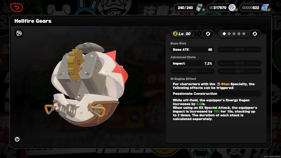 Hellfire Gears - это фирменный W-инструмент Коледы. Он создан для того, чтобы помочь ей быстрее восстанавливать энергию, пока она не на поле боя. Кроме того, она часто использует свою специальную атаку EX "Кипящая печь" для усиления эффекта, что позволяет Коледе наносить больше оглушений, пока она размахивает своим молотом на врагов.