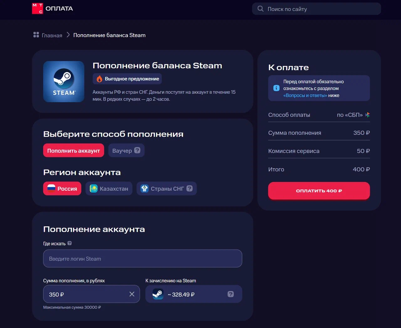 Весной 2022 года оператор представил возможность пополнения российского аккаунта Steam через Систему быстрых платежей (СБП). Этот способ считается одним из наиболее удобных и экономичных: не требуется вводить большое количество данных или конвертировать рубли в доллары. Однако стоит учитывать, что сервис взимает фиксированную комиссию в размере 50 рублей, а также дополнительную комиссию за конвертацию, которая может варьироваться от 4% до 8%. Примечательно, что для использования этой функции не обязательно быть клиентом МТС — она доступна всем пользователям.