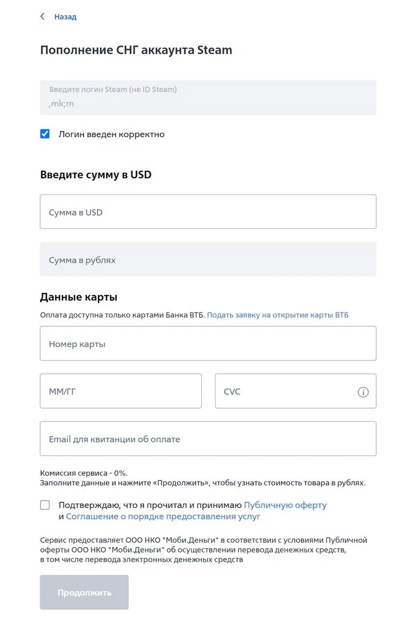 Еще один банк, который позволяет пополнить баланс Steam, — это ВТБ. Для использования этой услуги необходимо быть клиентом банка. В браузере нужно ввести запрос «пополнение кошелька Steam через ВТБ», найти соответствующую иконку Steam, указать логин и сумму в долларах, а затем ввести реквизиты карты. После оплаты средства поступят на ваш аккаунт в долларах и автоматически конвертируются в рубли. Однако стоит учитывать, что комиссия за операцию составит от 10% до 15%, что может быть ощутимо для крупных сумм.