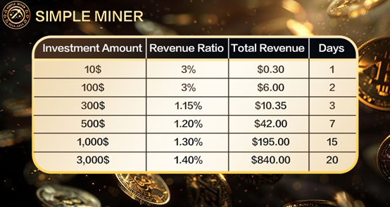 ④ Invitation income: By inviting friends to invest in Simpleminers, you can get a reward of 3% of the friend's investment. If your friend invites his friends to invest in Simpleminers, you can also get a reward of 1% of their investment. (Introduce money-making projects to friends, earn favors and make money at the same time, why not do it?)