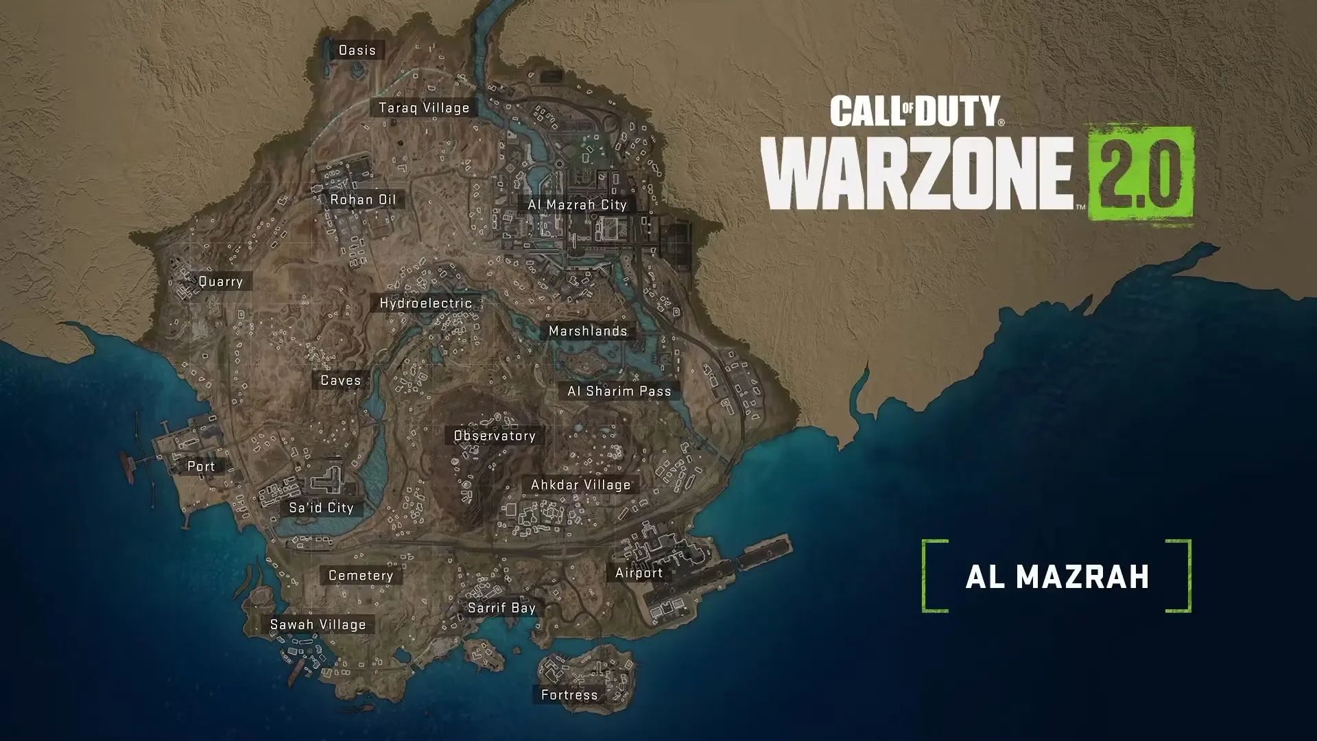 Карта Al Mazrah в Call of Duty: Warzone 2 - это самая большая карта из всех существующих на сегодняшний день в Call of Duty battle royale. Она включает 18 точек интереса, состоящих из совершенно новых районов и мест, которые должны быть знакомы давним поклонникам Call of Duty. Например, локация "Аэропорт" основана на любимой фанатами многопользовательской карте "Терминал", которая стала знаменитой в оригинальной игре Call of Duty: Modern Warfare 2 2009 года.