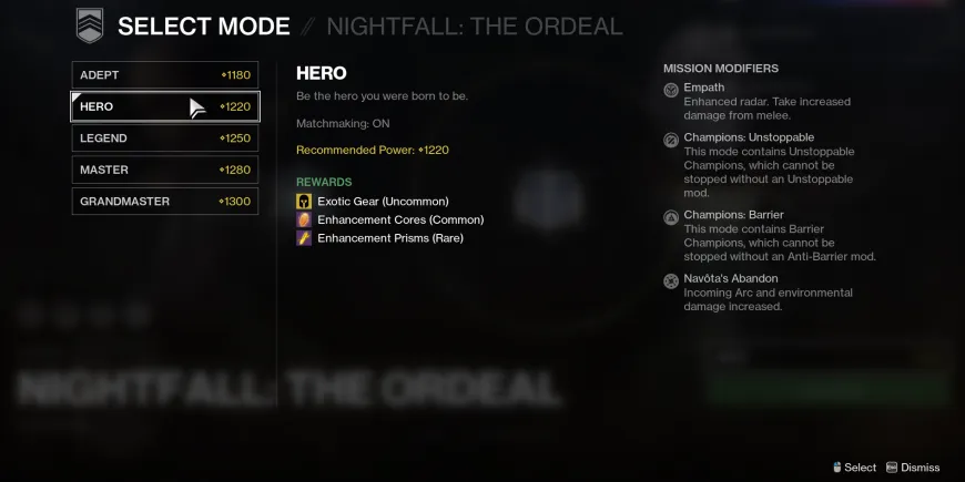 Завершение Nightfalls или Empire Hunts на уровне героя или выше имеет шанс предоставить улучшенные призмы по завершении. Мастер сложности имеет лучшее соотношение награды и времени, предоставляя две улучшенные призмы на платиновом завершении. Гроссмейстер Найтфоллс технически предоставляет больше—предоставляя четыре гарантированные улучшающие призмы по завершении с шансом получить еще одну или две—но Гроссмейстер Найтфоллс значительно сложнее, чем Мастер Найтфоллс.