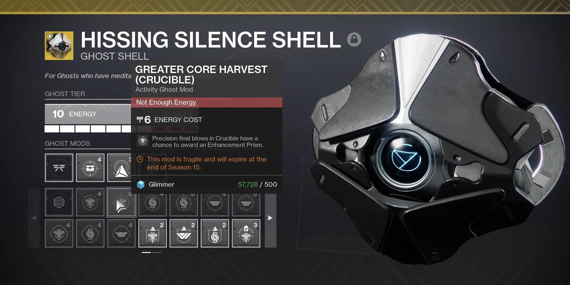 Мастерская работа с призрачной оболочкой откроет четвертый слот для модов, который может оснащать уникальные моды активности. Один из этих модов, Greater Core Harvest, позволяет игрокам получать улучшенные призмы, участвуя в основных действиях. Мод Harvest существует для каждого ритуального действия—Vanguard Ops, Crucible и Gambit.