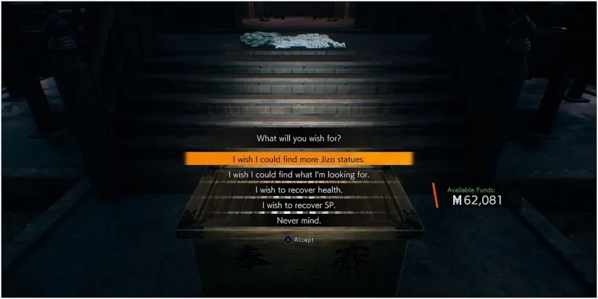 Во многих святынях и воротах Тории есть ящики для пожертвований. Вы можете пожертвовать либо 100M, либо 500M, и на основе того, что вы пожертвуете, вы получите возможность загадать желание. Одно из желаний покажет одну статую Дзидзо поблизости. Это невероятно полезно для определения местоположения статуи и может затруднить поиск статуй.