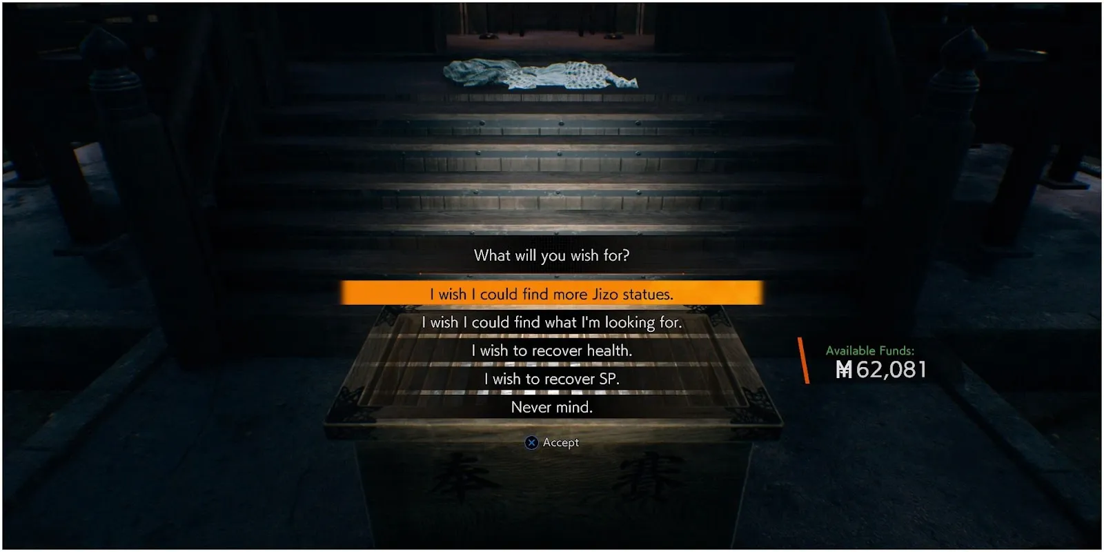 Во многих святынях и воротах Тории есть ящики для пожертвований. Вы можете пожертвовать либо 100M, либо 500M, и на основе того, что вы пожертвуете, вы получите возможность загадать желание. Одно из желаний покажет одну статую Дзидзо поблизости. Это невероятно полезно для определения местоположения статуи и может затруднить поиск статуй.