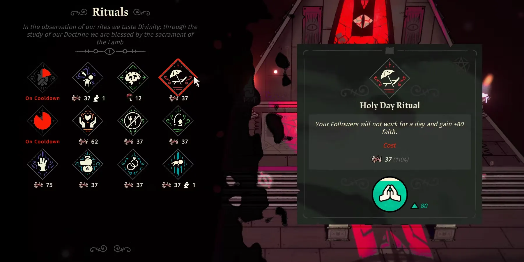 Игрокам, которые сталкиваются с трудностями в поддержании веры в своем культе, стоит подумать о том, чтобы поспешить к Ритуалу Святого дня, который может полностью спасти Ягненка в трудную минуту. Чтобы открыть этот ритуал, игрокам необходимо собрать достаточно каменных скрижалей для совершения доктрин, пока они не достигнут четвертого уровня "Работа и поклонение" на Древе доктрин. Здесь они могут выбрать Ритуал Святого дня (вместо Славы через труд, который заставляет последователей работать три дня без отдыха). Активация ритуала Святого дня позволит членам Культа отдохнуть целый день, то есть они не будут генерировать преданность, ухаживать за посевами, добывать и перерабатывать материалы.