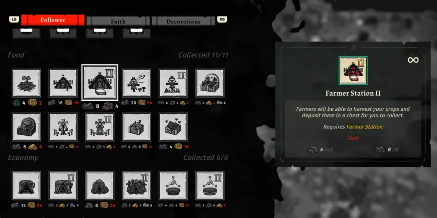 - Фермерская станция. Это одно из самых полезных фермерских зданий, потому что оно позволяет культистам поливать окружающие культуры. Модернизируйте ее до Фермерской станции II, и тогда посадка, выращивание и удобрение культур станет обязанностью культистов, а Ягненок сможет отдохнуть.