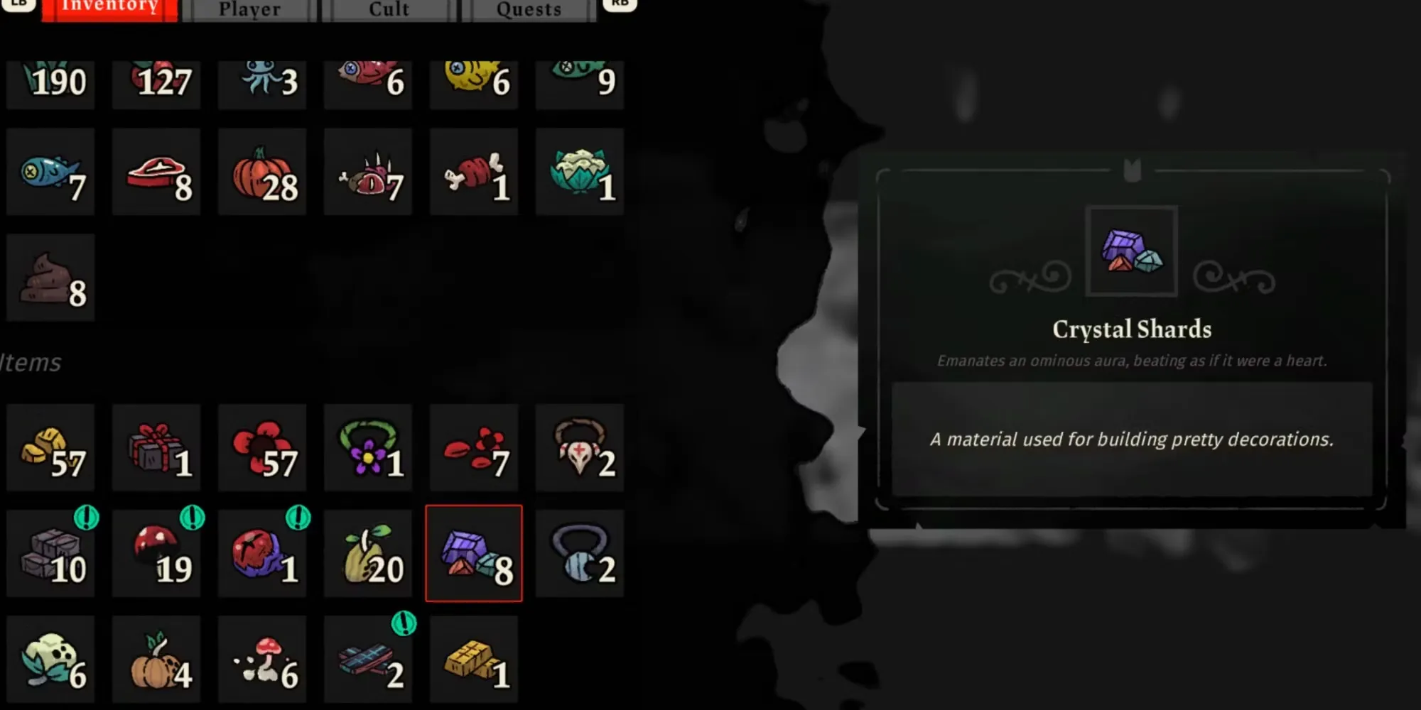 Некоторые предметы, необходимые для строительства зданий, являются менее обычными материалами для ремесел, например цветы или паутина, и их можно найти только в определенных местах. Ягненок не столкнется с определенными материалами, пока у него не будет достаточно последователей, чтобы открыть более высокие уровни Крестового похода.