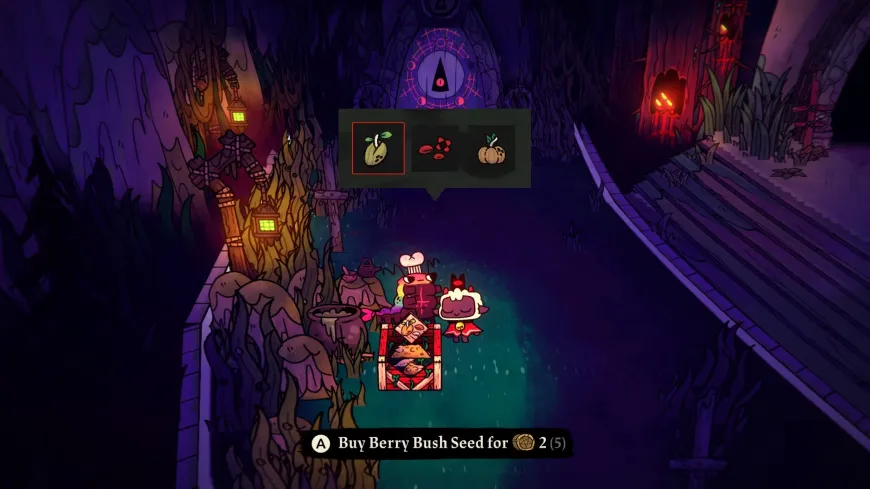 - Торговцы. В Cult Of The Lamb есть несколько торговцев, и у некоторых из них можно купить семена. Один торговец, продающий только семена и овощи, находится у ворот в Анкордип.