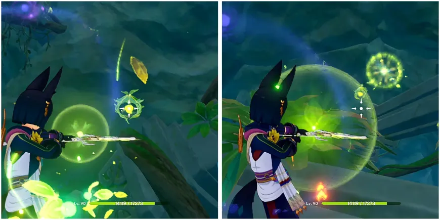 Подойдите к Дендрограну в углу и призовите его. Затем используйте любой лук персонажа, чтобы выстрелить в два объекта Дендро.