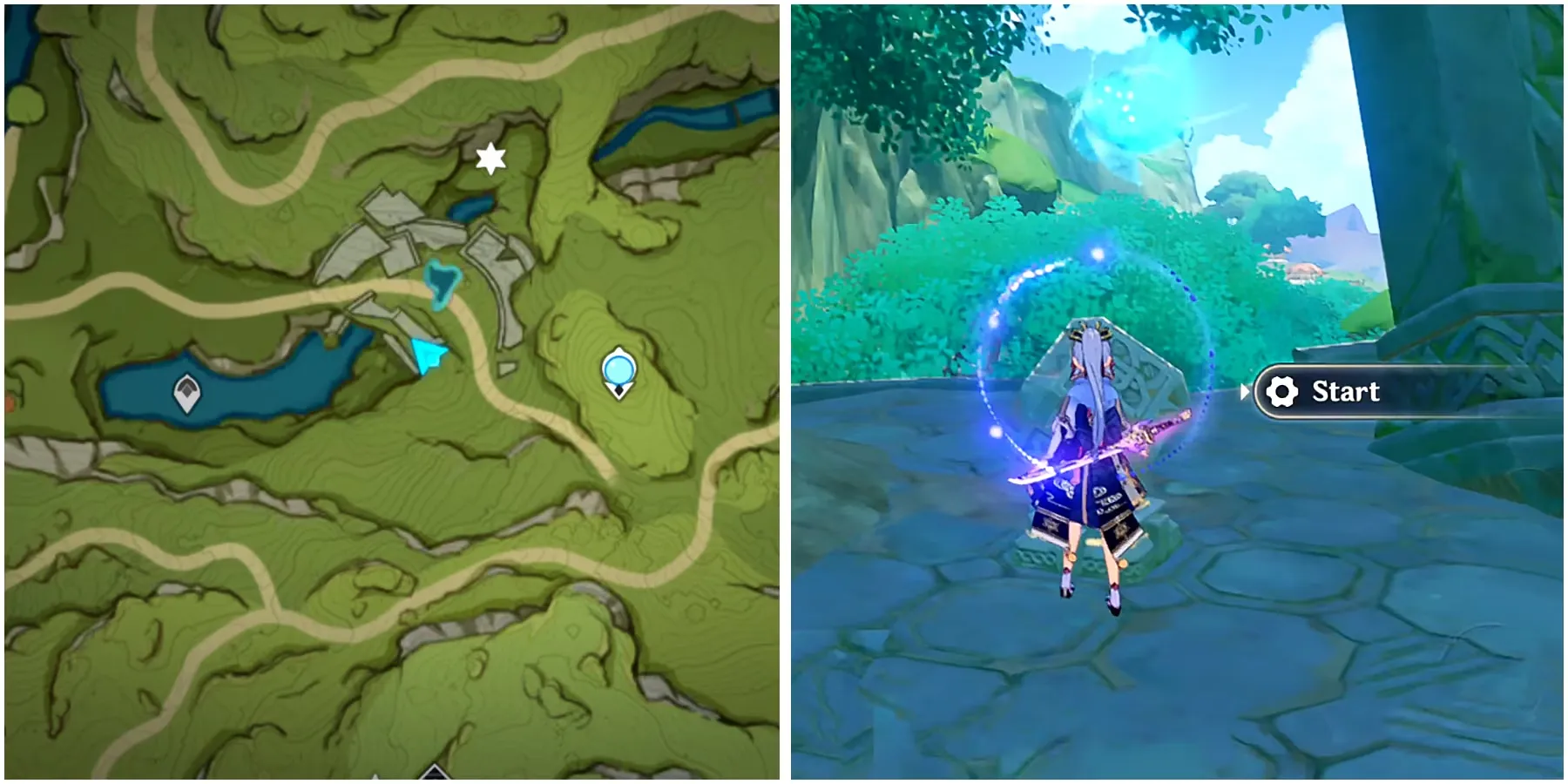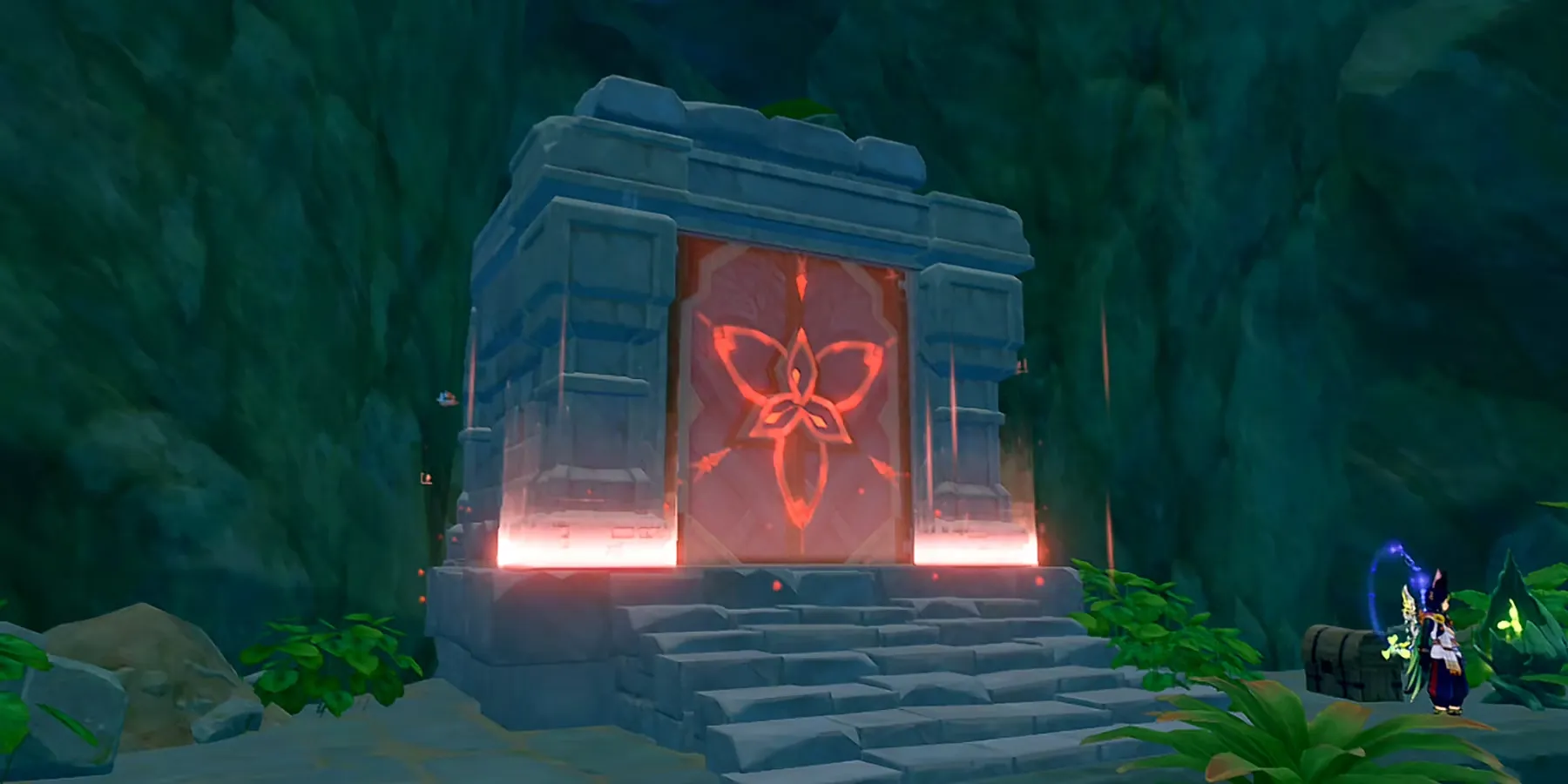 Выйдя на сушу, используйте любого персонажа Дендро в Genshin Impact, чтобы атаковать скалу, обвитую ветвями, и открыть Дендрогранум. Призовите Грану и используйте Заряженную атаку на запечатанные камни неподалеку, чтобы открыть Монумент элементаля Дендро и скрытый путь.