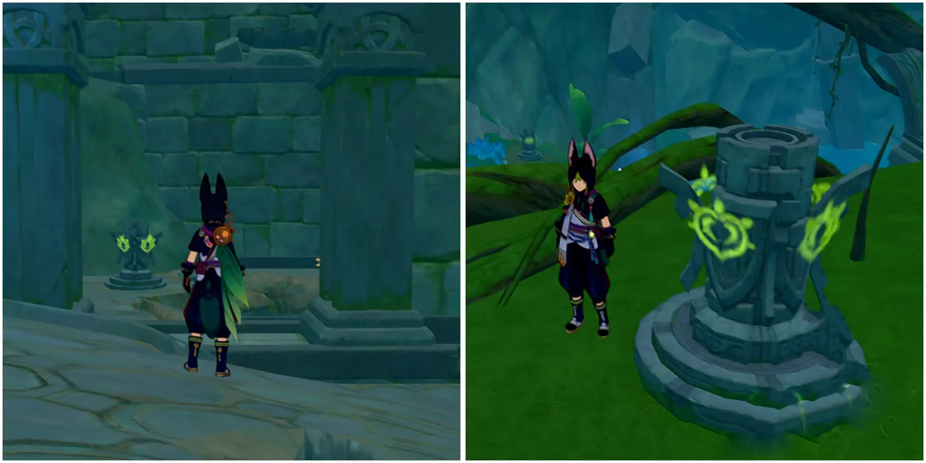 Чтобы добраться до него, просто используйте четырехлистный знак на вершине. После активации всех четырех монументов Дендро воспользуйтесь расположенным рядом механизмом, чтобы снова слить воду. Это откроет точку подводного телепорта поля Виссудха в Геншин Импакт.
