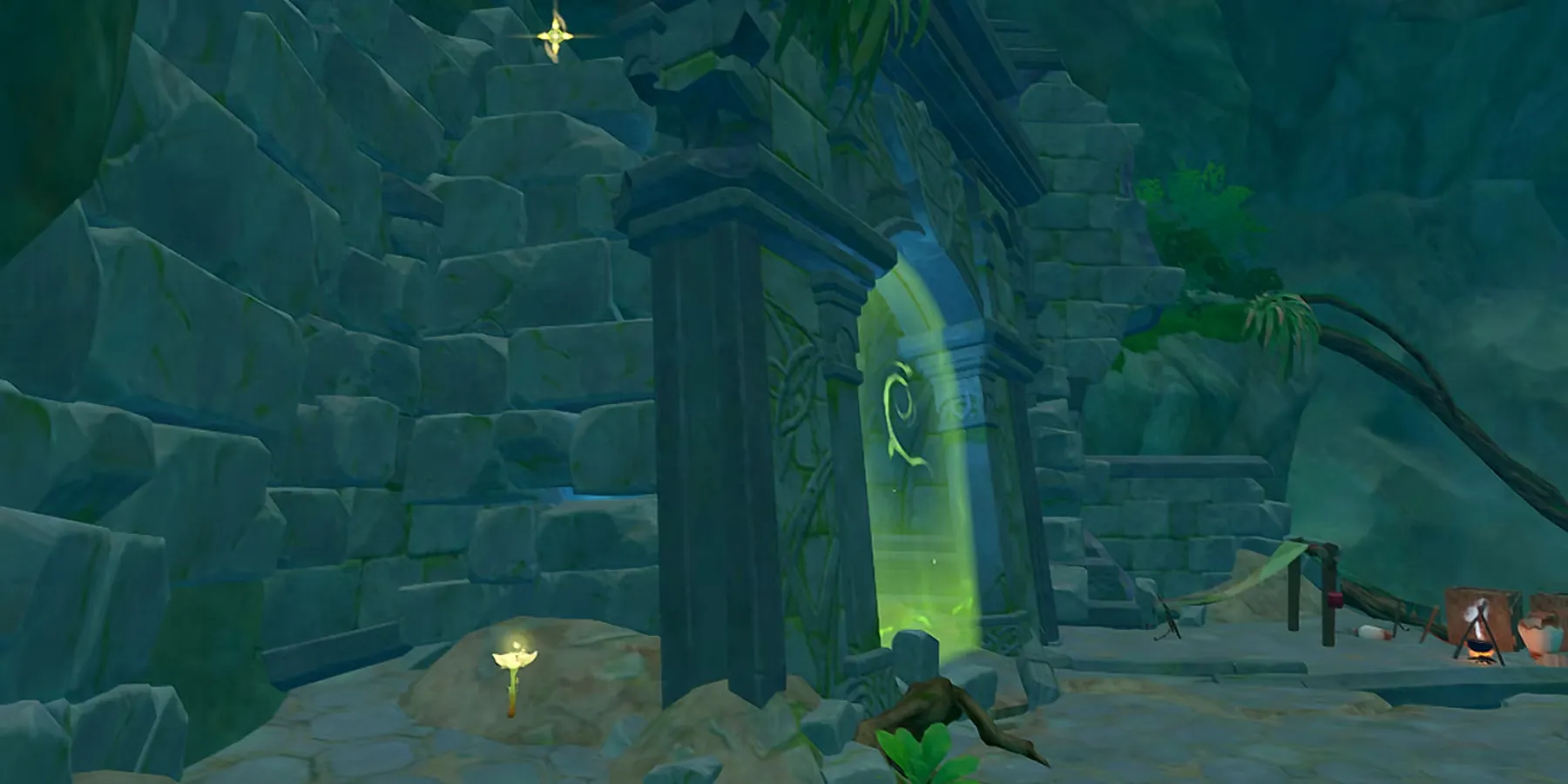 Вдоль тропы будут стоять два монумента Дендро. Это означает, что на данный момент у игроков должно быть три активированных монумента Дендро. Тем временем четвертый заперт за зеленым барьером с врагами вокруг него.