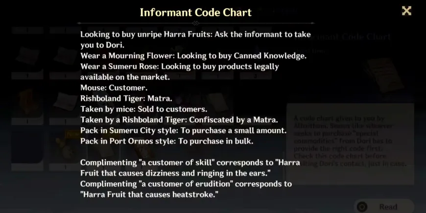 Поскольку в инвентаре Дори много запрещенных предметов, она должна быть осторожна в выборе того, с кем разговаривает. У торговца есть система кодов для ее осведомителей, чтобы отсеять надежных покупателей, и игрокам предстоит выбрать все правильные ответы, чтобы завоевать доверие Раунака в Genshin Impact.
