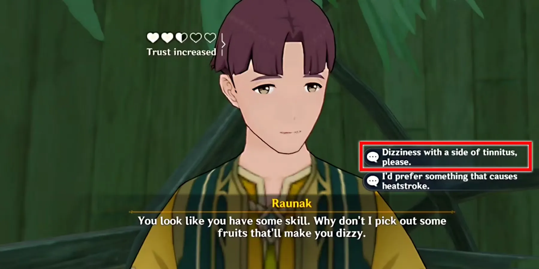 Теперь, когда Раунак спрашивает путешественников, как упаковать фрукты Харра, в стиле города Сумеру или Порт Ормос, игроки должны ответить в стиле Порт Ормос, чтобы заполнить счетчик и заслужить доверие Раунака.