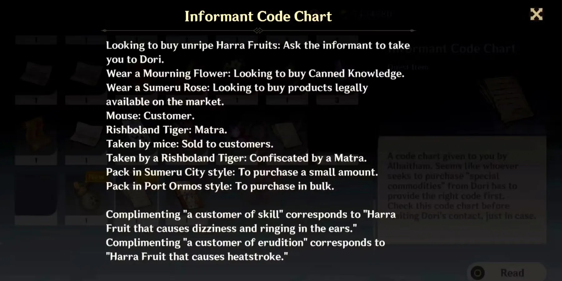 Чтобы попасть к Дори, игроки должны пройти через одного из ее информаторов, Раунака, который действует только с помощью кодов. Кодовая карта информатора, которую Алхаитам дал путешественнику, очень важна. Игроки должны проверить эту таблицу, прежде чем связаться с Раунаком, чтобы завоевать его доверие.