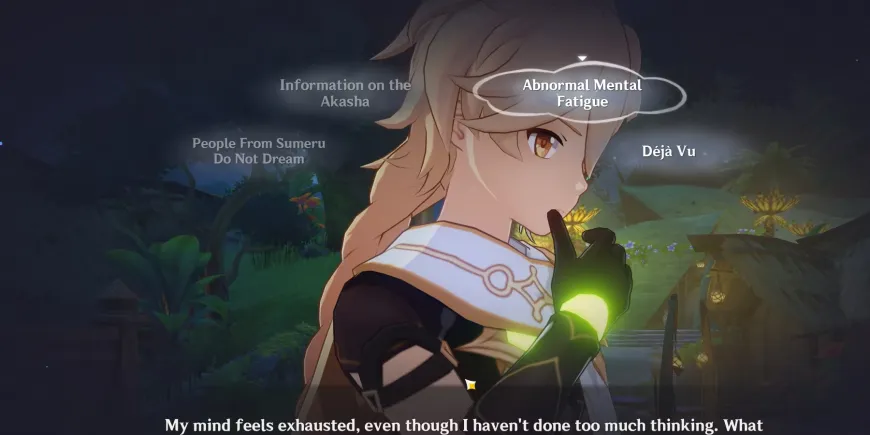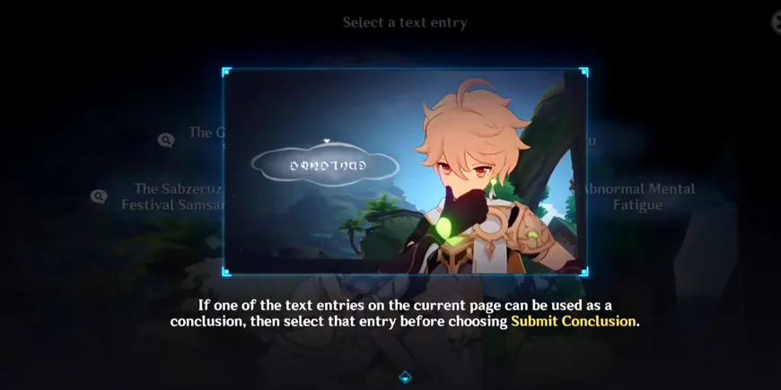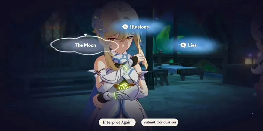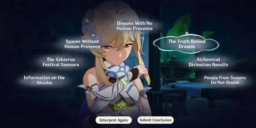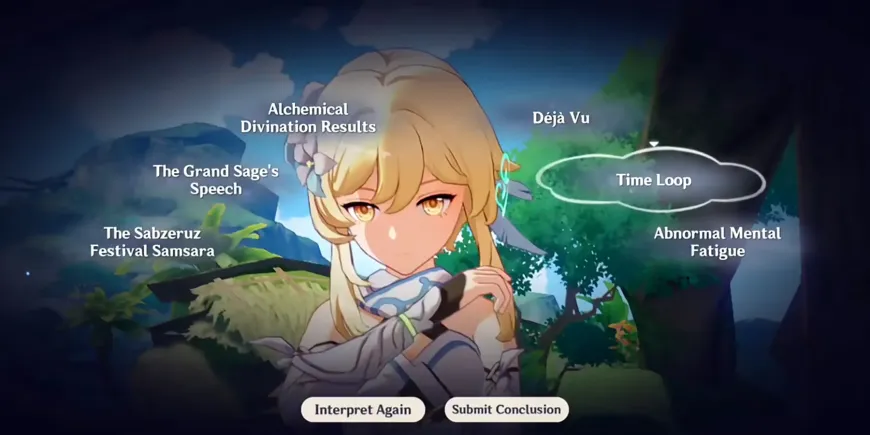 Путешественники будут входить в состояние Созерцания несколько раз в этом квесте. Иногда после интерпретации мысли загорается опция, указывающая на то, что игроки могут связать ее с другой мыслью. Когда игроки закончат размышлять, им нужно будет воспользоваться кнопкой "Отправить заключение", чтобы ответить Нахиде.
