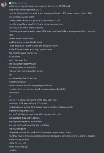 Бывшая сотрудница Activision Blizzard Джессика Гонсалес использовала Twitter, чтобы обвинить своего коллегу Джеффа Фрейзера в публикации на сервере Discord под названием "Правое крыло игр", где он сливал личную информацию, делал сексистские замечания о стажерах и подшучивал над трансгендерными работниками под псевдонимом Nebu. Фрейзер не ответил на эти обвинения.