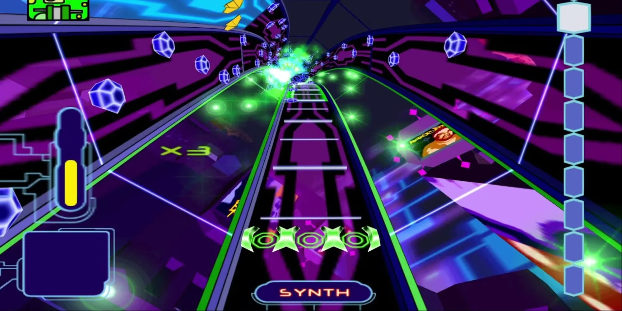 Frequency напоминала космическую стрелялку: маленький корабль летел по дорожке, ловя ноты на ходу. Правильное попадание в ноты позволяло треку играть автоматически в течение некоторого времени, в то время как открывались новые треки с другими инструментами. Это было невероятно весело, и в ней звучала музыка таких групп, как No Doubt, Orbital и собственной группы режиссера Freezepop. Однако сегодня о ней забыли из-за больших успехов Harmonix, и, похоже, вряд ли она когда-нибудь будет возрождена.