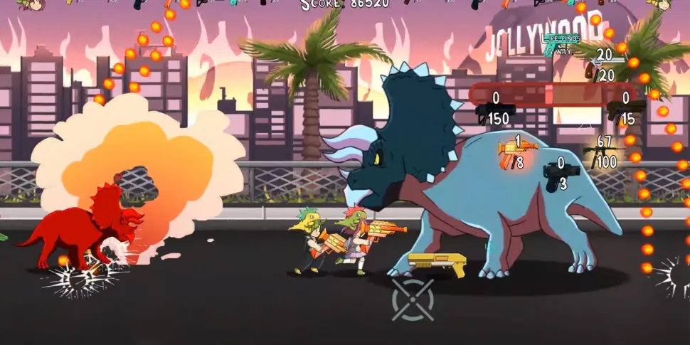 Чем дольше она продержится, тем опаснее становятся динозавры, от ужасающих трицепатопсов до огромного Т-рекса - одно прикосновение этих динозавров, и Прох погибнет. В DAMNOSAUR также есть локальная кооперативная игра с разделенным экраном, так что игроки могут вместе бегать и стрелять в хаосе.