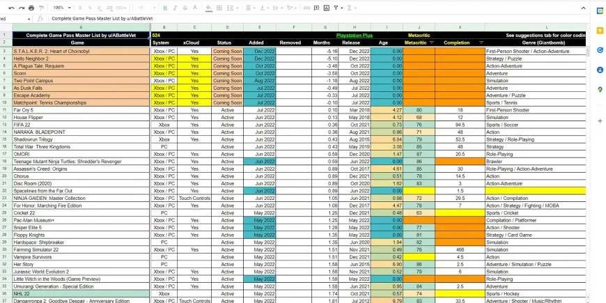 Поскольку Xbox Game Pass включает в себя эксклюзивные игры как для ПК, так и для консолей Xbox, необходимость классификации и удобного просмотра каталога очевидна. В попытке сделать процесс просмотра максимально информированным, модератор Redditor и сообщества Xbox Game Pass ABattleVet составил очень удобную электронную таблицу, которую можно просматривать онлайн через Google Sheets. Список имеет цветовую кодировку и включает ряд информативных категорий, таких как дата выхода, рейтинг Metacritic, платформа и жанр. В списке также есть вкладка для каталога бесплатных игр EA Play, где показаны как доступные в данный момент игры, так и удаленные.
