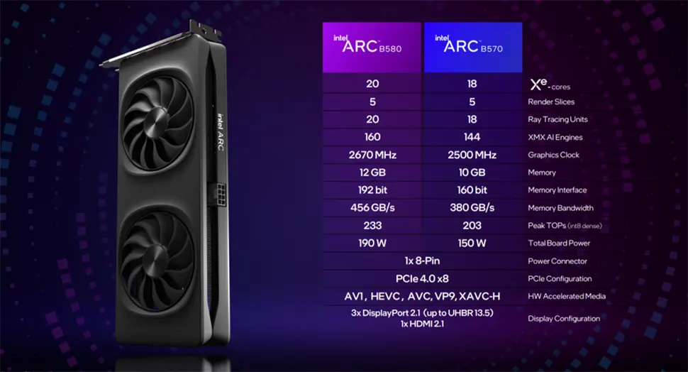 Arc B580 построена на архитектуре Xe 2, которая стала следующим шагом в эволюции видеокарт Intel. Её основные параметры включают: