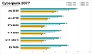 Тесты на 1440p продемонстрировали, что B580 стабильно работает с высокими настройками графики, включая трассировку лучей. В играх вроде Cyberpunk 2077 и F1 24, где трассировка лучей активирована, Intel Arc B580 показала превосходные результаты, выигрывая у RTX 4060, особенно на минимальных частотах кадров. При этом, благодаря увеличенной памяти и более широкому интерфейсу шины, Intel Arc B580 смогла обеспечить высокую стабильность кадров и минимальные задержки, что особенно важно в динамичных играх.