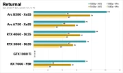 Хотя RX 7600 обладает схожими характеристиками, её ограничение по объёму памяти и узкая шина делают её менее подходящей для игр с высокими требованиями в 1440p. При включении трассировки лучей Arc B580 чаще оказывается впереди.