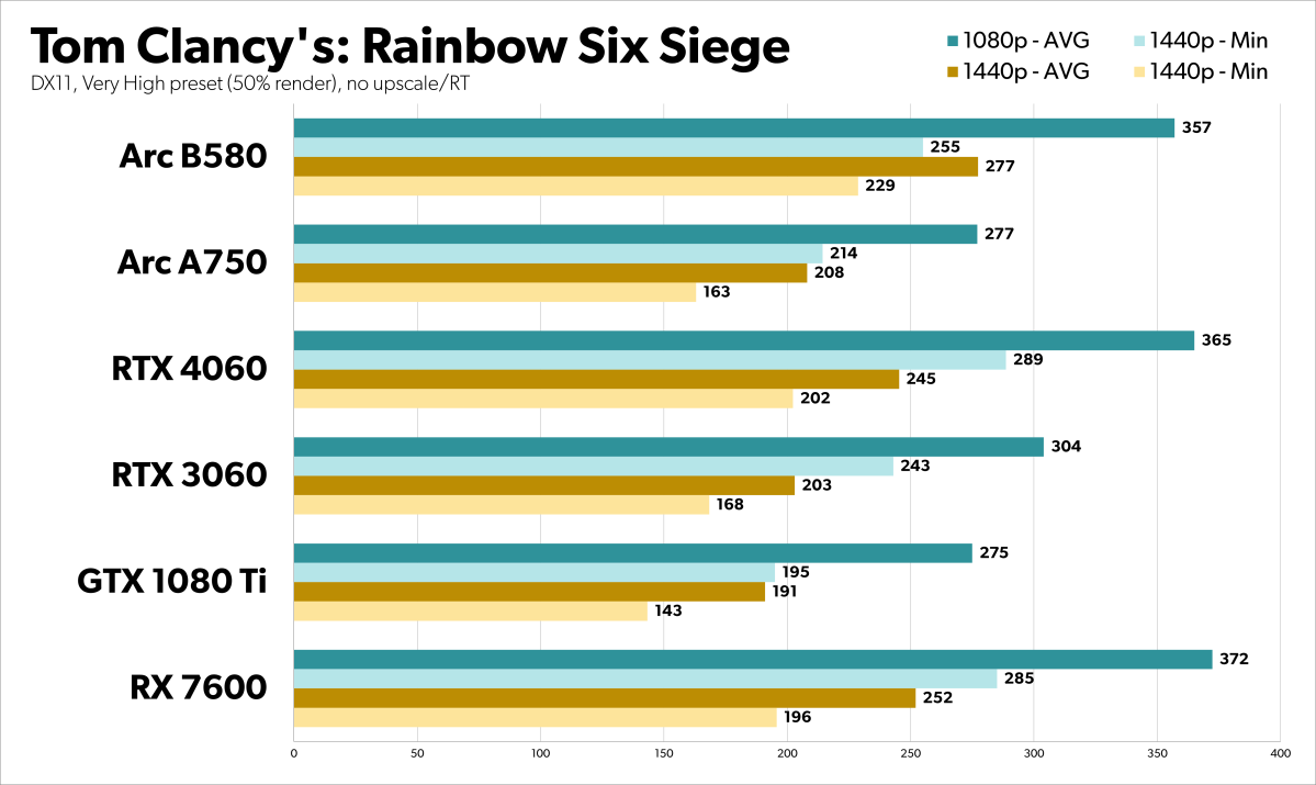 При разрешении 1080p, Intel Arc B580 демонстрирует отличные результаты, сопоставимые с более дорогими моделями конкурентов. В сравнении с Nvidia RTX 4060, производительность на большинстве тестируемых игр почти идентична. Однако в некоторых случаях B580 демонстрирует небольшое преимущество, особенно в играх, где требуется высокая пропускная способность памяти и эффекты трассировки лучей.