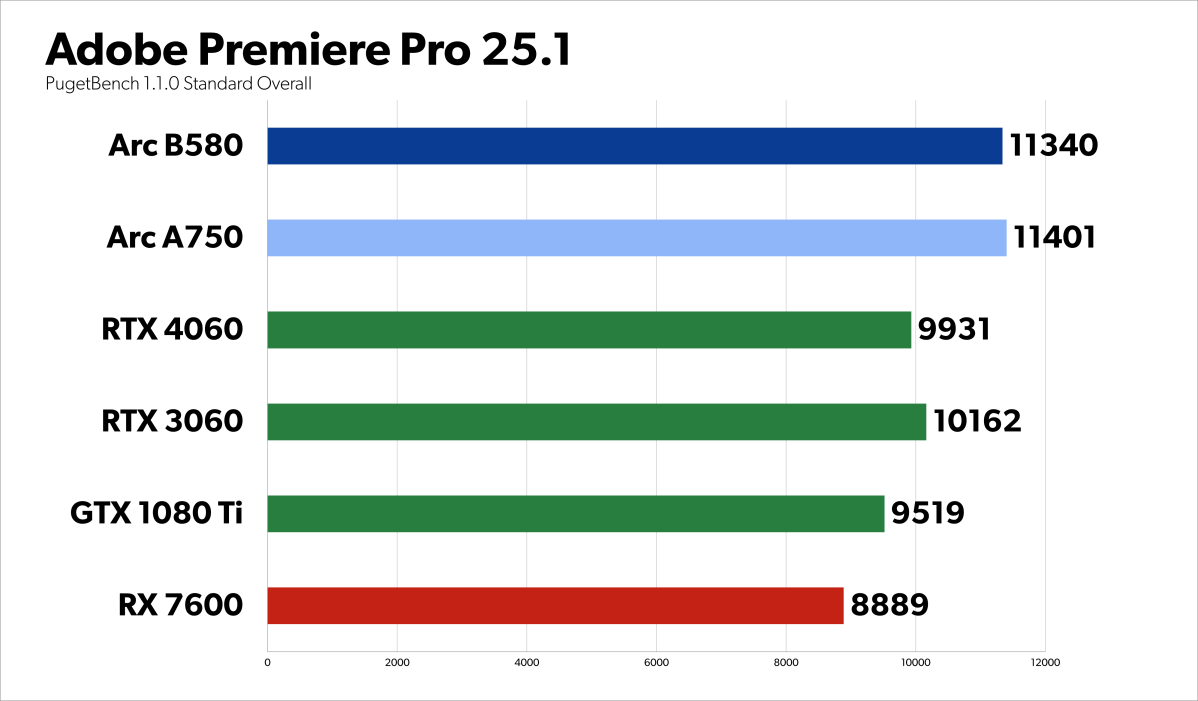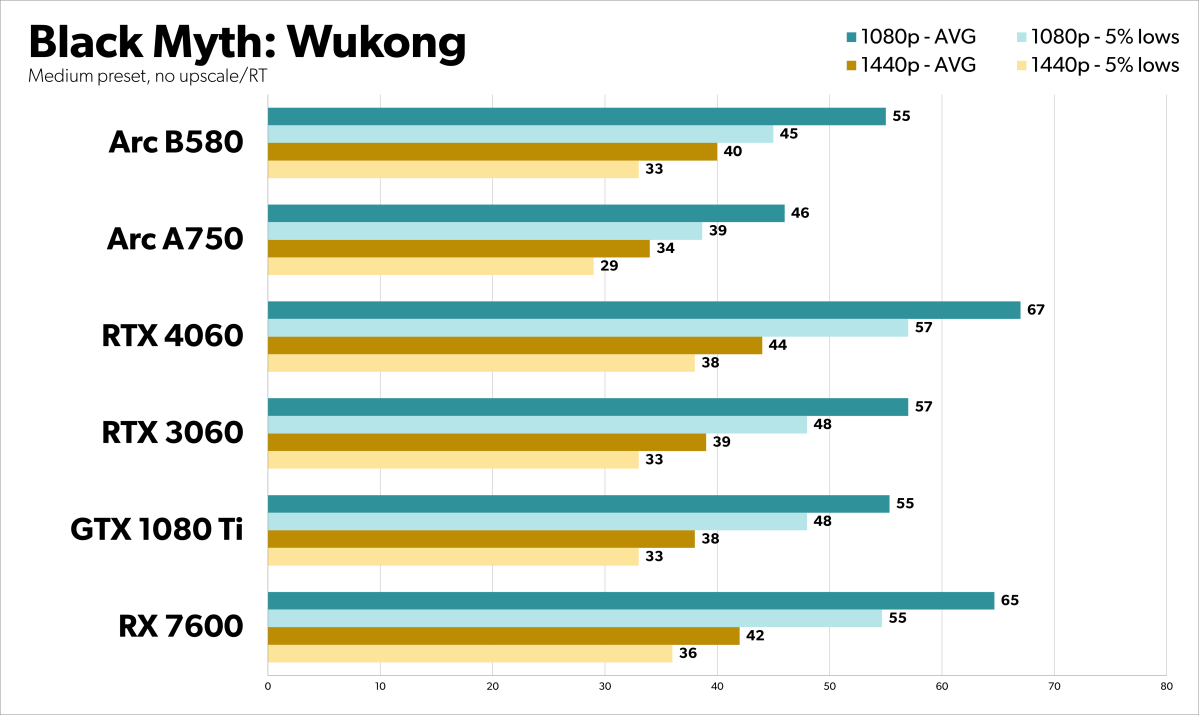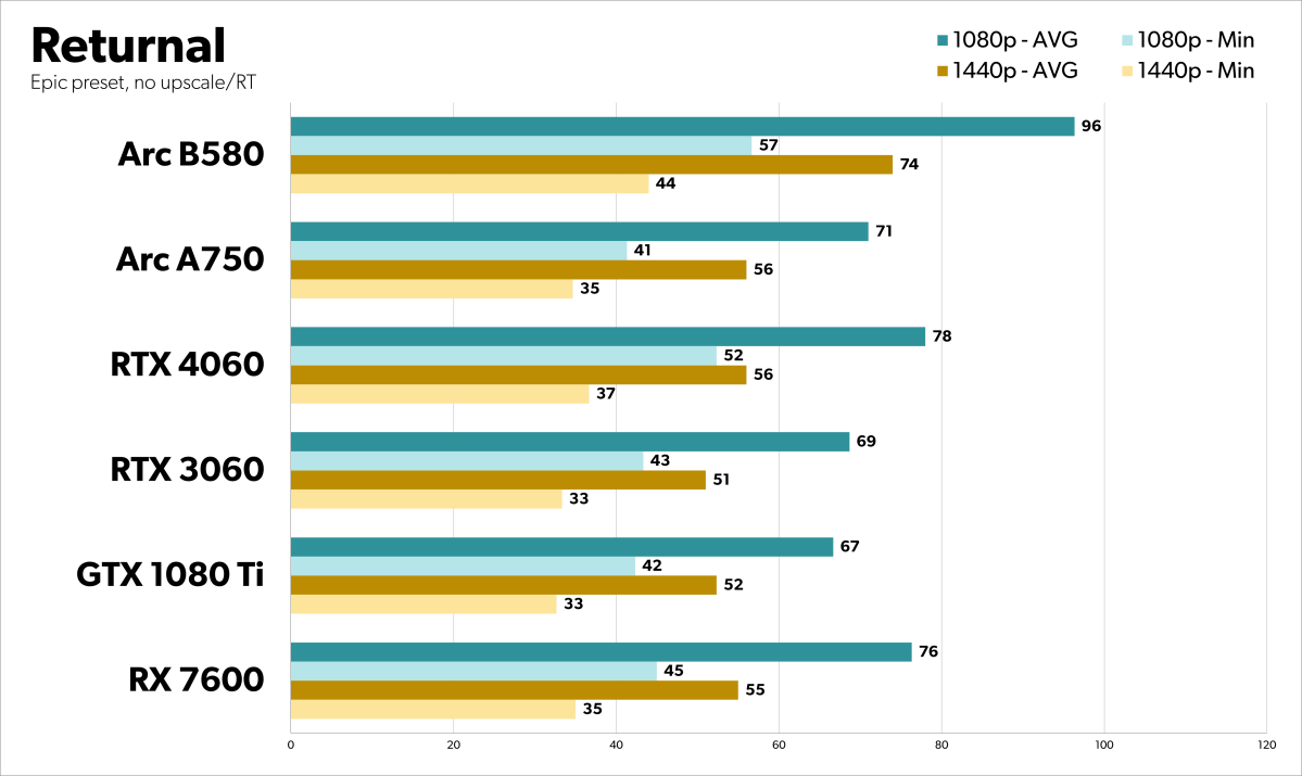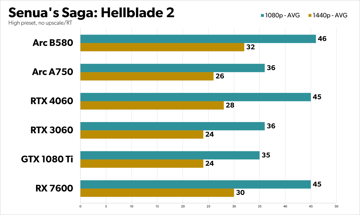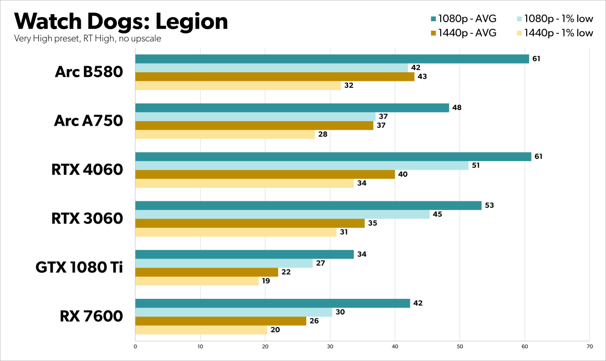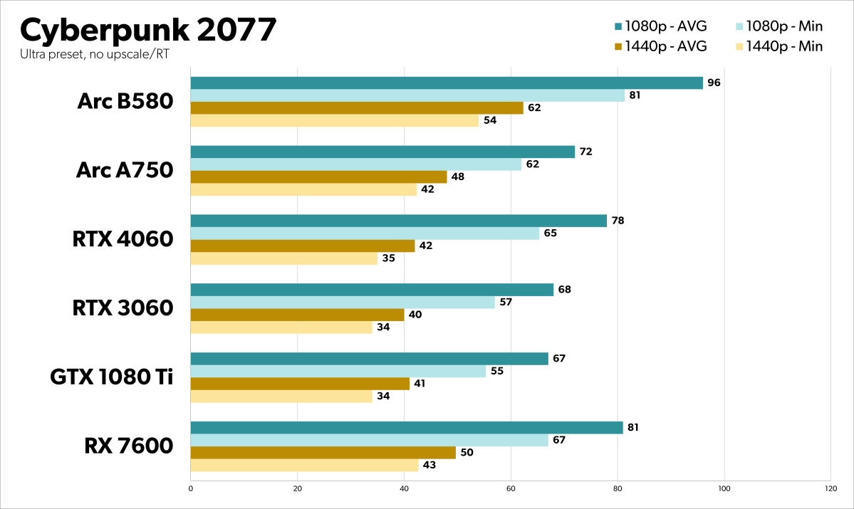Хотя RX 7600 обладает схожими характеристиками, её ограничение по объёму памяти и узкая шина делают её менее подходящей для игр с высокими требованиями в 1440p. При включении трассировки лучей Arc B580 чаще оказывается впереди.