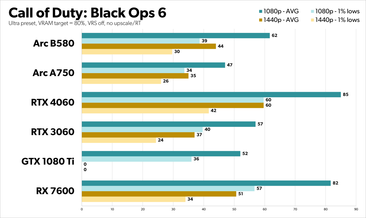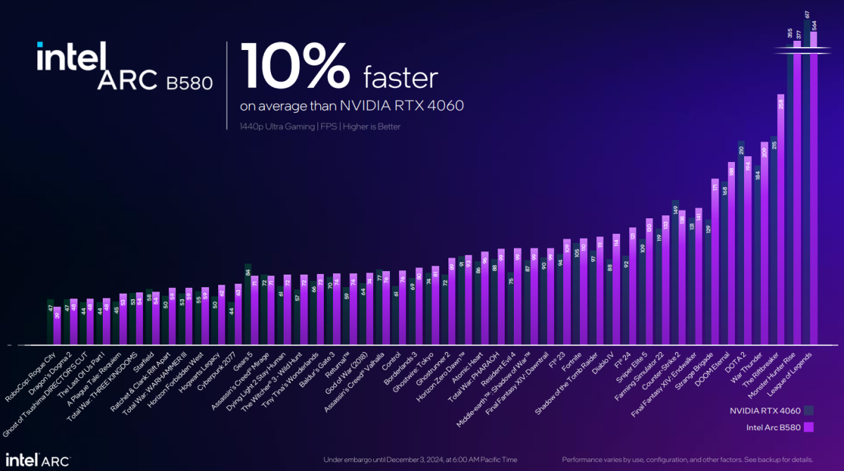 При разрешении 1080p производительность Arc B580 сопоставима с RTX 4060. Однако при переходе на 1440p преимущество Intel становится очевидным благодаря большему объёму памяти, который обеспечивает стабильный FPS даже в сложных играх.