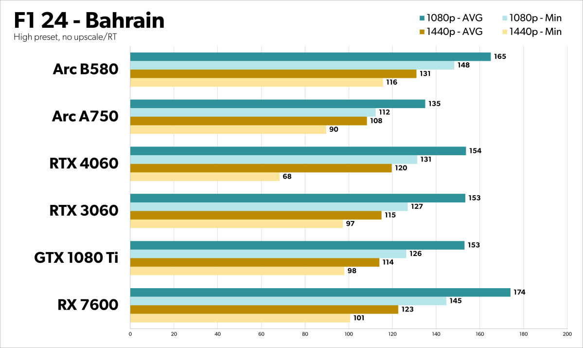 Тесты на 1440p продемонстрировали, что B580 стабильно работает с высокими настройками графики, включая трассировку лучей. В играх вроде Cyberpunk 2077 и F1 24, где трассировка лучей активирована, Intel Arc B580 показала превосходные результаты, выигрывая у RTX 4060, особенно на минимальных частотах кадров. При этом, благодаря увеличенной памяти и более широкому интерфейсу шины, Intel Arc B580 смогла обеспечить высокую стабильность кадров и минимальные задержки, что особенно важно в динамичных играх.