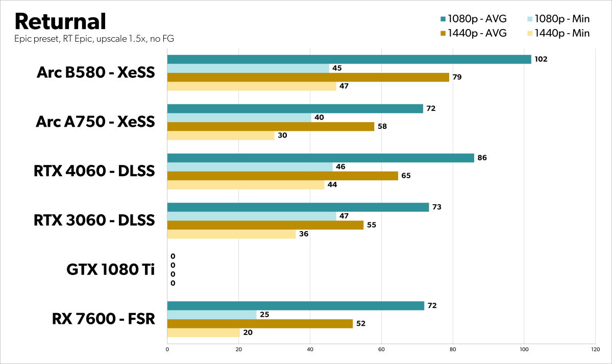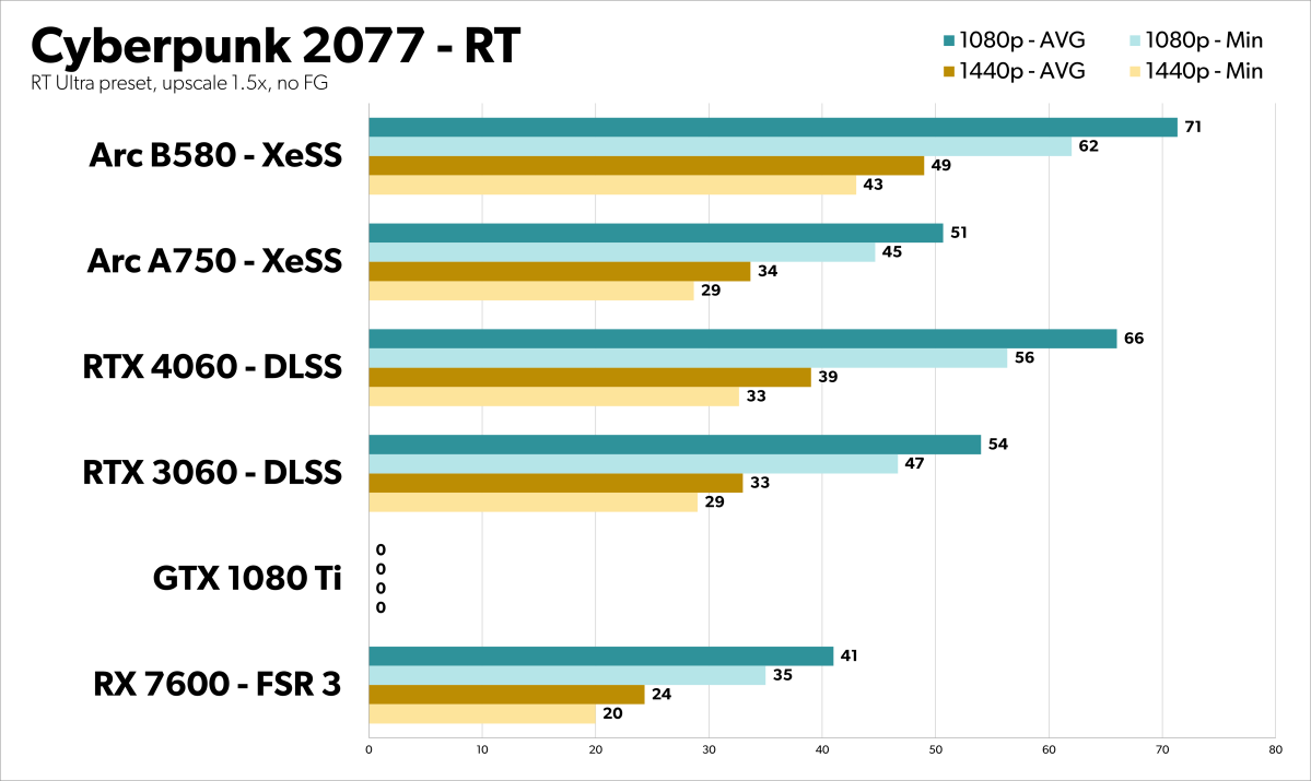 Тем не менее, большинство современных игр показывают отличные результаты на Intel Arc B580, с хорошими минимумами и максимами кадров. Важно отметить, что производительность в играх с трассировкой лучей и масштабированием с использованием XeSS значительно выигрывает от более высокой пропускной способности памяти и 12 ГБ видеопамяти, что делает B580 отличным выбором для геймеров, ориентированных на 1440p.