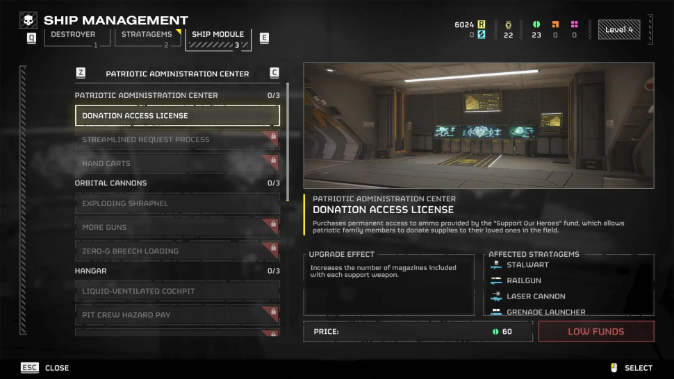 A primeira atualização custa 60 amostras e oferece uma licença Donation Access. Esta licença é um excelente investimento, aumentando a quantidade de pentes para sua arma. Role o menu para baixo e encontre as atualizações que você mais gosta.