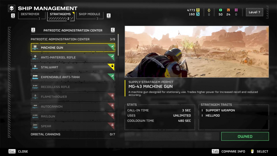 - Controle de navio: Na seção "Estratagemas", você desbloqueará vários estratagemas que o ajudarão na batalha. Eles exigem um certo nível para desbloquear e créditos de requisição para comprar. Na seção "Módulos de envio", você compra várias atualizações para seus estratagemas gastando amostras.