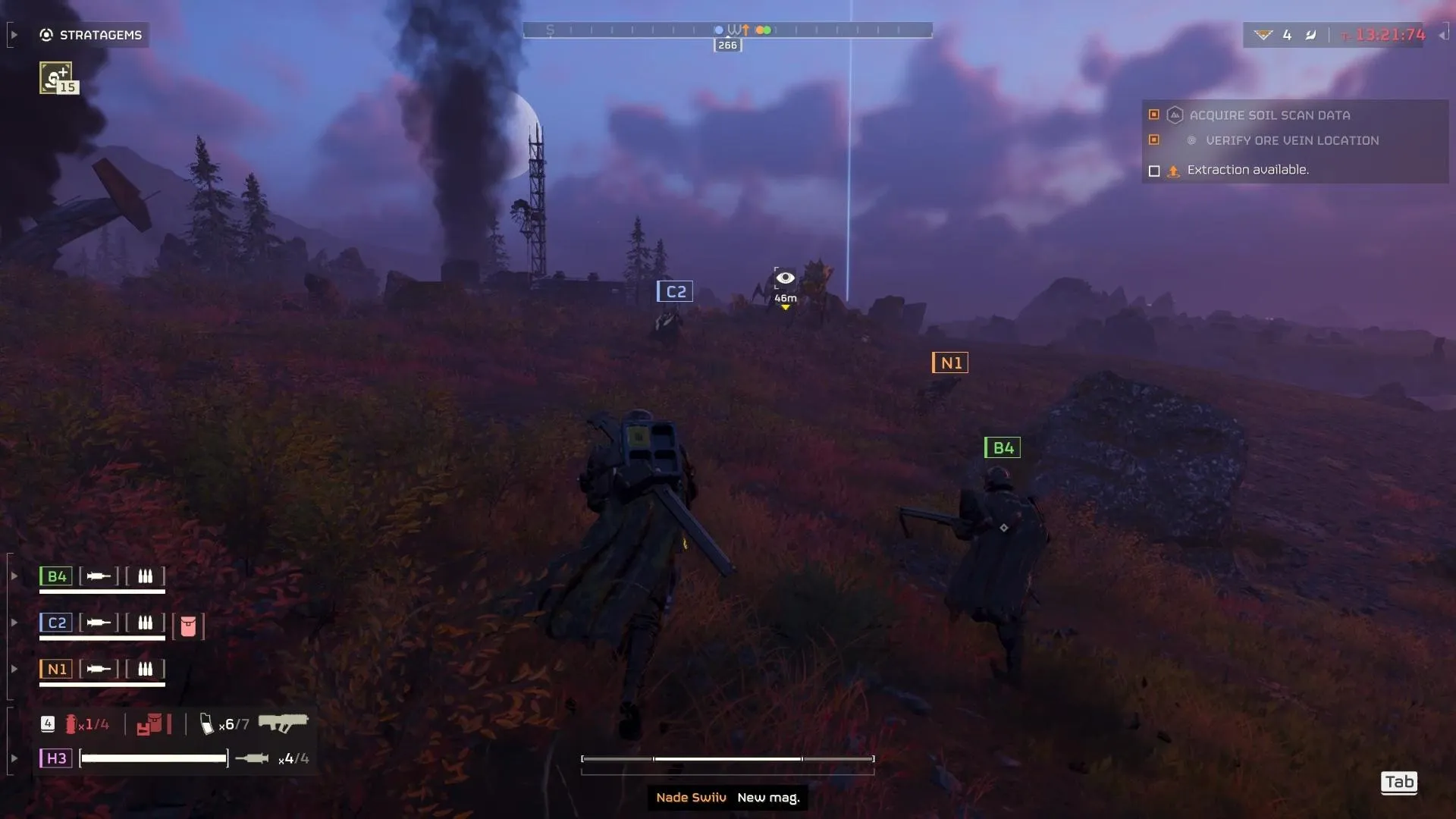 Essas são as três formas principais de avançar no jogo. Ao completar tarefas você ganha XP e níveis. Cada arma e estratagema que você desbloqueia tem seus próprios benefícios contra certos inimigos. Preste atenção às missões que você realiza e escolha o equipamento adequado. Se você estiver jogando com amigos, desbloqueie diferentes itens e atualizações que complementem os pontos fortes e fracos de cada um para facilitar a conclusão das missões.
