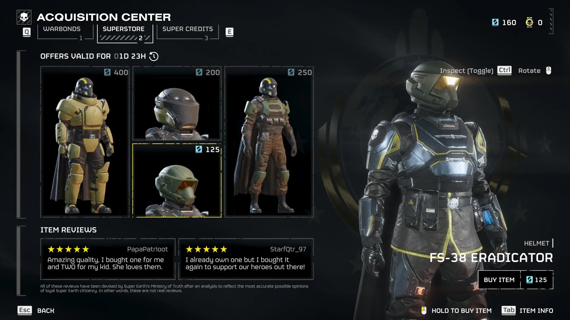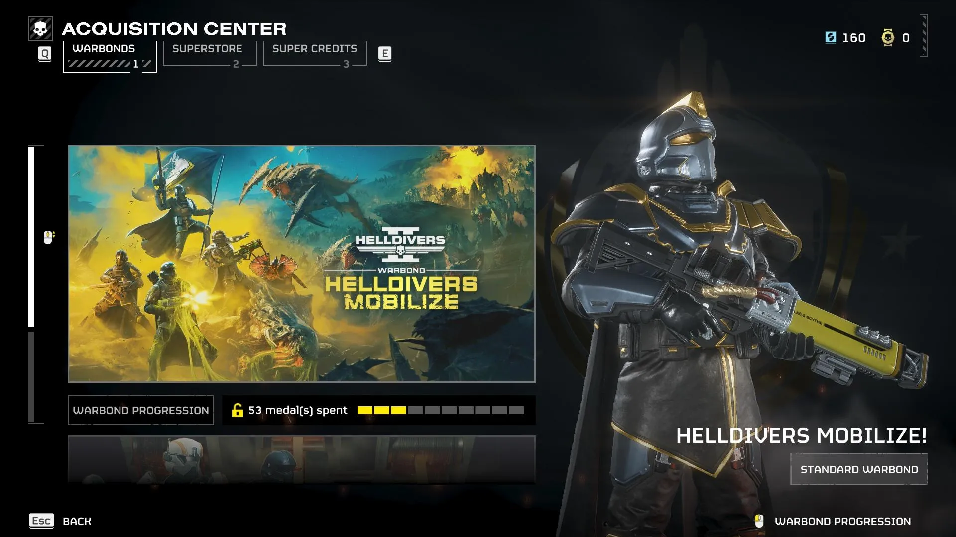 - Warbond Shops: Aqui você pode gastar medalhas e supercréditos para desbloquear diversas armas, armaduras, itens cosméticos e boosters.