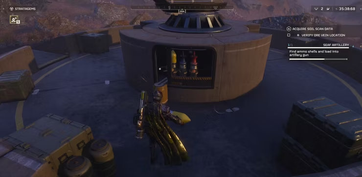 Quando você estiver carregando um projétil, interaja com a câmera na lateral do canhão para carregá-lo. Depois que cinco cartuchos forem carregados, ative o terminal novamente para preparar o canhão. Seu esquadrão agora pode convocar um ataque de artilharia usando o Estratagema de Artilharia da SEAF.