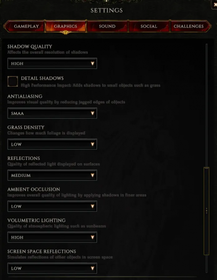 A iluminação volumétrica simula neblina e poeira. Para uma imagem mais nítida, é melhor usar um nível muito baixo. Os níveis baixo e médio criam neblina usando a luz solar, enquanto os níveis alto e muito alto adicionam mais luz solar para um efeito de neblina mais realista. O Ultra, no entanto, não oferece nenhum benefício.